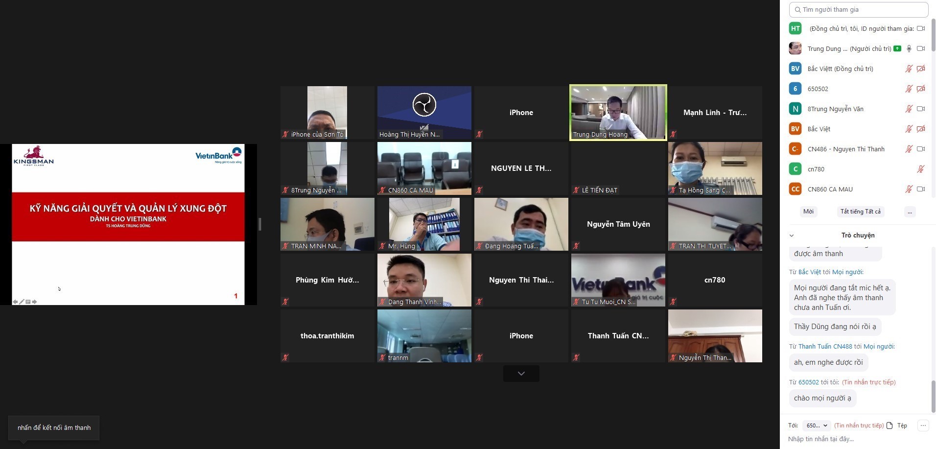 Hiểu rõ được tầm quan trọng của kỹ năng giải quyết và quản lý xung đột, dù trong tình hình dịch bệnh căng thẳng, Vietinbank đã phối hợp cùng Tổ chức Giáo dục Kingsman tổ chức khóa học theo hình thức online. Kingsman đã áp dụng cộng nghệ vào khóa học cùng việc điều chỉnh giáo án sinh động, linh hoạt hơn nên vẫn đảm bảo được nội dung và tính hấp dẫn của khóa học.