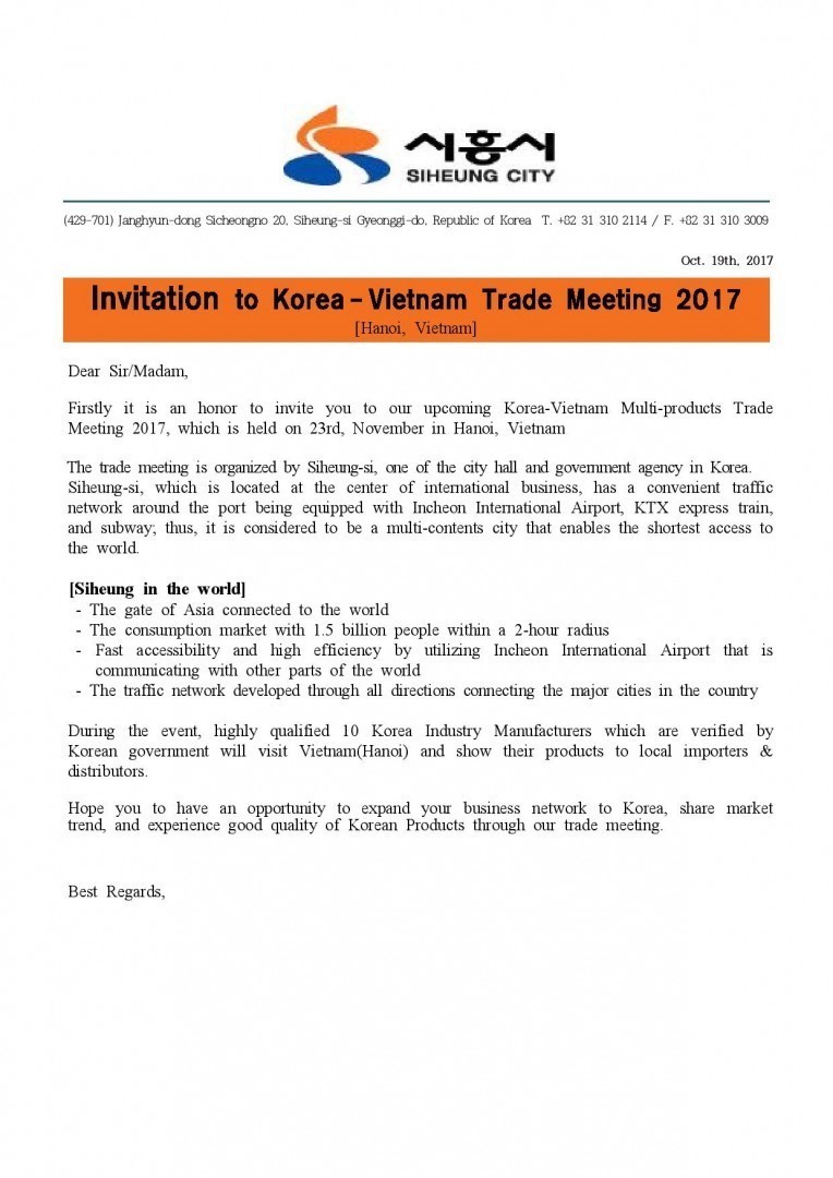 23/11/2017, với sự nhất quán ủng hộ của các cơ quan ban ngành đoàn thể 2 nước, đại diện thành phố SIHEUNG – Hàn Quốc tại Việt Nam tổ chức chương trình kết nối giao thương Việt – Hàn tháng 11 năm 2017.