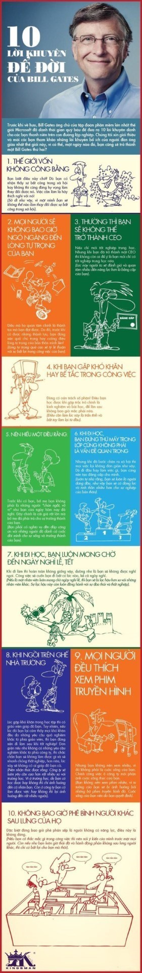 Trước khi về hưu, Bill Gates ông chủ của tập đoàn phần mềm lớn nhất thế giới Microsoft đã dành thời gian quý báu để đưa ra 10 lời khuyên dành cho các bạn thanh niên trên con đường lập nghiệp. Chúng tôi xin giới thiệu và mời các bạn tham khảo những lời khuyên bổ ích của người đàn ông giàu nhất thế giới này, vì có thế, một ngày nào đó, bạn cũng sẽ trở thành một Bill Gates thứ hai?