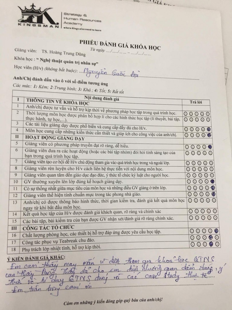“Tôi thấy rằng bảng đánh giá này không phù hợp để đánh giá khoá học về nhân sự do thày Hoàng Trung Dũng giảng dạy. Cách truyền đạt của thày vượt lên tất cả các tiêu chí mà bảng đánh giá đưa ra, bởi nó đi sâu vào trái tim và ghi sâu vào tâm trí… Tôi thật sự thay đổi tư duy về công việc nhân sự mình đang làm và có thêm động lực để theo đuổi con đường này. Cảm ơn thầy rất nhiều”